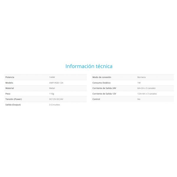 El amplificador es un dispositivo que puede aumentar la señal de potencia, dando la posibilidad de conectar más cantidad de productos con un solo controlador, y así evitar que la señal se vea comprometida. Debido a sus pequeñas dimensiones permite su instalación en espacios reducidos. Puede aplicarse a los módulos de LEDs, tiras de LEDs, barras de LEDs y módulos de alta potencia, entre otros productos