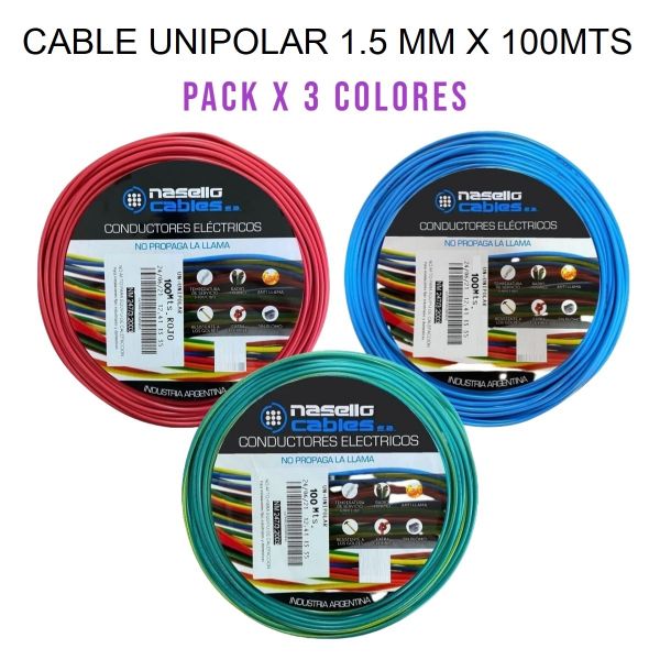 CABLE UNIPOLAR 1.5 MM X 100M PACK X 3 COLORES (ROJO - CELESTE - VERDE/AMARILLO)