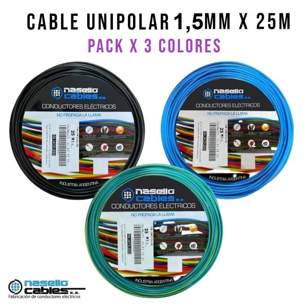 CABLE UNIPOLAR 1.5 MM X 25M PACK X 3 COLORES (NEGRO - CELESTE - VERDE/AMARILLO)