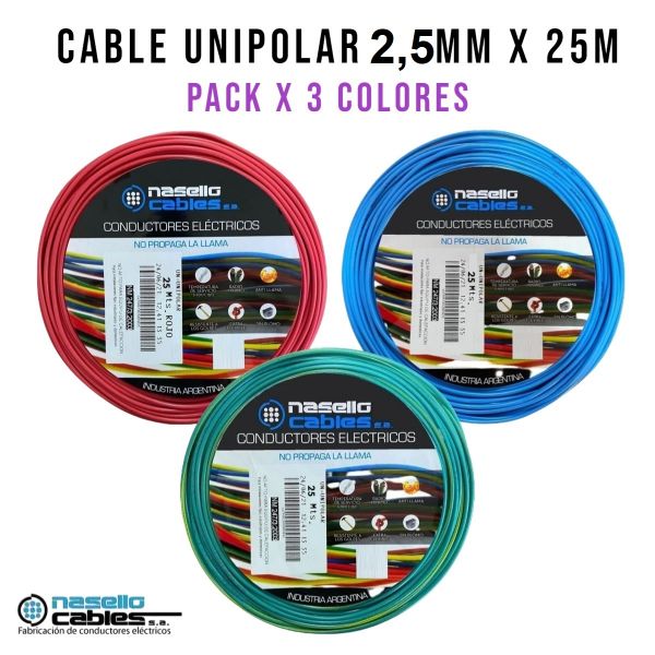 CABLE UNIPOLAR 2.5 MM X 25M PACK X 3 COLORES (ROJO - CELESTE - VERDE/AMARILLO)