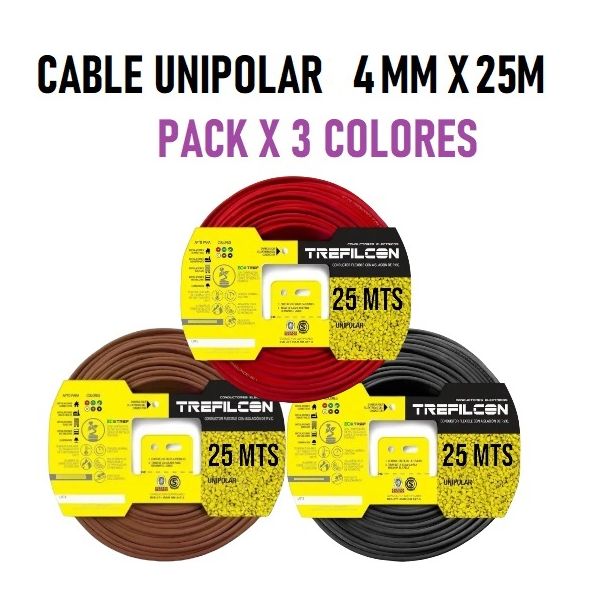 CABLE UNIPOLAR 4 MM TREFILCON X 25M PACK X 3 COLORES (MARRON - ROJO- NEGRO)
