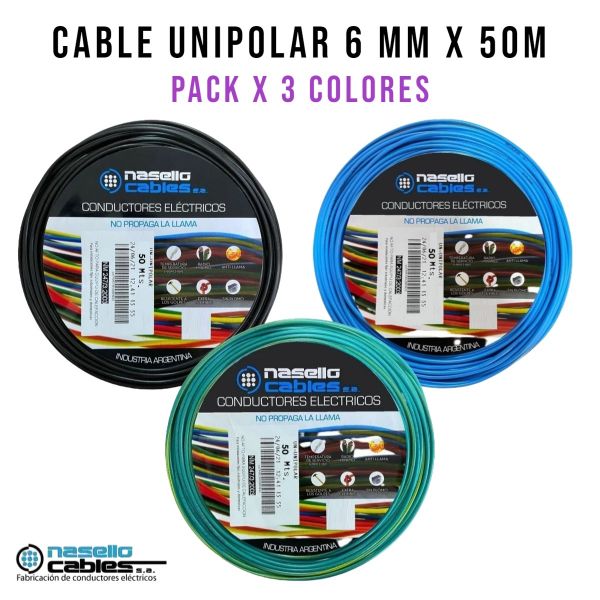 CABLE UNIPOLAR 6 MM X 50M PACK X 3 COLORES (NEGRO - CELESTE - VERDE/AMARILLO)