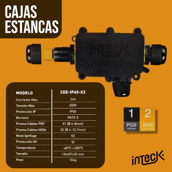 CAJA ESTANCA IP65 3 PINES CON PROTECCION UV 1 ENTRADA 2 SALIDAS INTEK