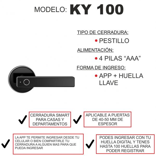 • caracteristicasCERRADURA SMART PARA CASAS Y DEPARTAMENTOS: Permite: - Ingreso a través de la APP: Te permite ingresar desde tu celular o bien compartirletu cerradura alguna persona y que esta pueda ingresar - Ingreso por Huella Digital: ingreso mediante simplemente tu dedo y de todaslas personas que registres con su huella. Hasta 100 huellas - Ingreso con Llave Mecánica: Te olvidaste la clave? o estuviste fuera de casa mucho tiempo y no viste el aviso de bateria baja?. No importa podes también ingresar con algunas de las llaves incluidas en el kit. MUY FACIL DE INSTALAR! SOLO ES NECESARIO CAMBIAR EL PICAPORTE! TOTALMENTE ADMINISTRABLE DESDE LA APP! Permite dar de alta, dar de baja y modificar todos los usuarios de la cerradura. Función (ABM) Distintas formas de habilitaciones a los usuarios: Permanente: El ingreso esta habilitado siempre Temporal: el ingreso solo es valido dentro del periodo establecido Único: Uso: el ingreso solo sirve para una única vez Cíclico: el ingreso es valido solo para