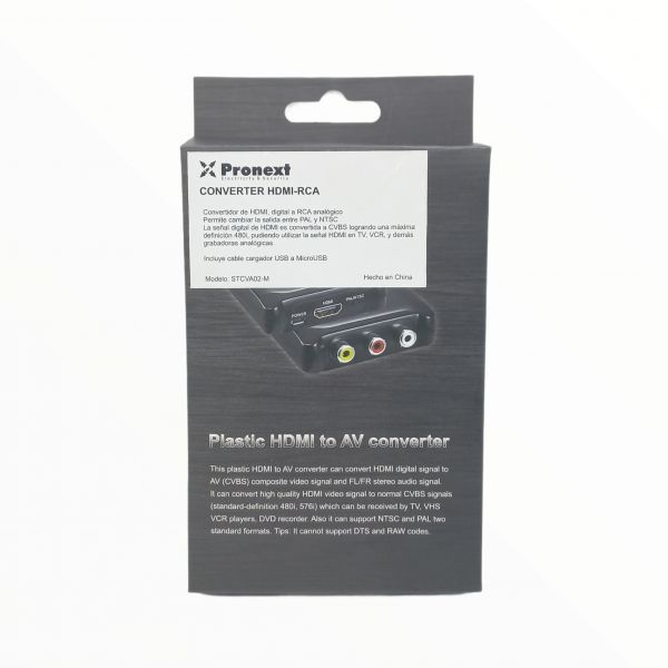 -No necesita drivers de instalación. Portable, liviano, su alimentación es por USB -Compatible con HDMI 3.0, soporta NTSC y PAL -Entrada HDMI: 480p / 720p / 1080p / 60HZ -Salida RCA: PAL, NTSC -Tamaño 66mm x 55mm x 20mm -Peso 40gr -Unidireccional de HDMI hacia RCA -Incluye cable de alimentación USB y manual de usuario