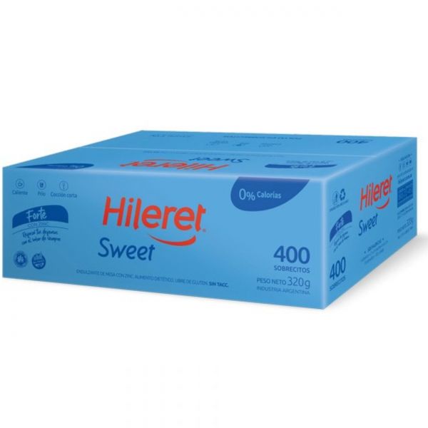 Para que puedas elegir tu manera de endulzar, tenemos que darte opciones. E Hileret Sweet es la que combina dos componentes (aspartamo y acesulfame k) para ofrecerte un poder endulzante único.Hileret Sweet endulza jugos, infusiones y -gracias a que puede utilizarse en cocciones cortas- es muy bueno para preparar recetas dulces sin agregar calorías. Además, este sustituto del azúcar no contiene sodio. Lo que lo hace muy apropiado para quienes, por razones de salud, no pueden consumirlo.
