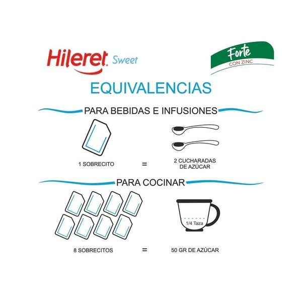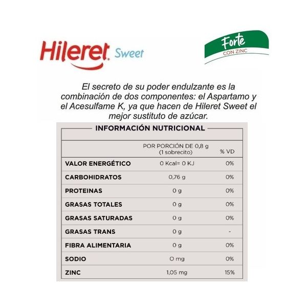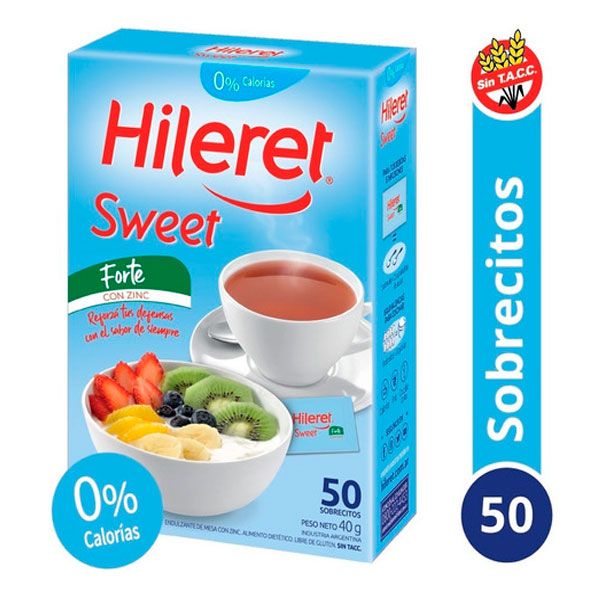 Para que puedas elegir tu manera de endulzar, tenemos que darte opciones. Hileret Sweet es la que combina dos componentes (aspartamo y acesulfame k) para ofrecerte un poder endulzante único. Hileret Sweet endulza jugos, infusiones y -gracias a que puede utilizarse en cocciones cortas- es muy bueno para preparar recetas dulces sin agregar calorías. Además, este sustituto del azúcar no contiene sodio. Lo que lo hace muy apropiado para quienes, por razones de salud, no pueden consumirlo.