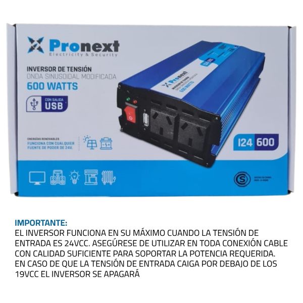 • DESCRIPCION ENCABEZADOInversor de Tensión Pronext I24-600 de 600W Los inversores de tensión PRONEXT, generan 220 V de CORRIENTE ALTERNA a partir de 24V de CORRIENTE CONTINUA, proveniente de baterías, las cuales pueden ser cargadas mediante sistema de energía alternativa (paneles solares, turbinas eólicas o hidráulicas). Es posible de esta manera alimentar equipos de 220 V CA en lugares remotos donde no existe la red pública. También son comúnmente utilizados en Campings, Casas rodantes, y vida al aire libre.