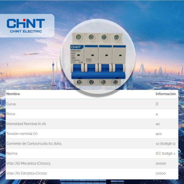 LLAVE TERMICA TETRAPOLAR 4X40A 10KA CURVA D CHINT