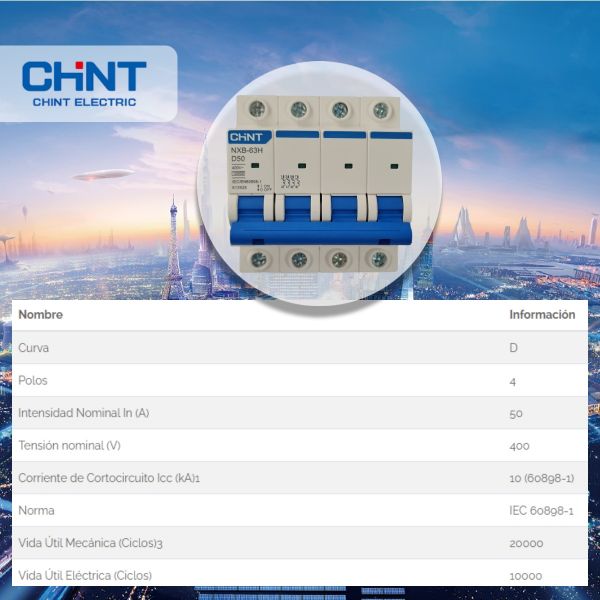 LLAVE TERMICA TETRAPOLAR 4X50A 10KA CURVA D CHINT