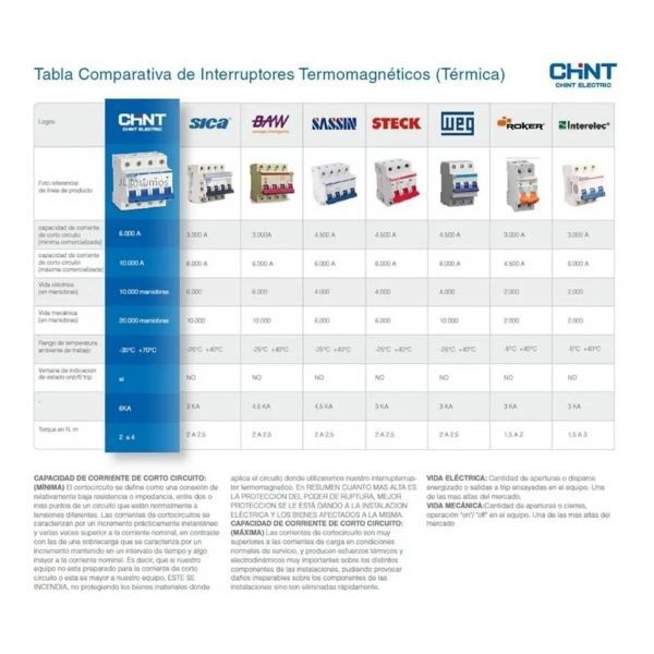 • caracteristicasUn interruptor termomagnético o llave térmica, es un dispositivo capaz de interrumpir la corriente eléctrica de un circuito cuando ésta sobrepasa ciertos valores máximos. Su funcionamiento se basa en dos de los efectos producidos por la circulación de corriente en un circuito: el magnético y el térmico.El dispositivo consta, por tanto, de dos partes, un electroimán y una lámina bimetálica, conectadas en serie y por las que circula la corriente que va hacia la carga.Al igual que los fusibles, los interruptores magnetotérmicos protegen la instalación contra sobrecargas y cortocircuito.