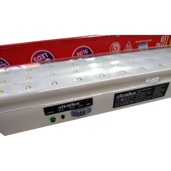 Luminaria autónoma No-Permanente. Encendido automático ante un corte de energía. Fuente de luz: 60 Leds de alto brillo. Pulsador "TEST" para prueba de encendido. Batería LITIO- ION recargable libre de mantenimiento. Cargador interno autorregulado. Mantiene la bateria totalmente cargada y protegida de sobrecargas. LED Rojo indicador de Carga. Sistema de corte por fin de autonomía. Protege la batería de sobredescarga. Orificios para colgar a la pared o amurar. Las Luminarias Autónomas Atomlux están diseñadas para encenderse instantánea-mente ante un corte de energía. Casi no requieren instalación. Sólo deben conectarse a la de red de energía eléctrica para su funcionamiento. Cuando vuelve la energía, los equipos se apagan y recargan su batería en forma automática.