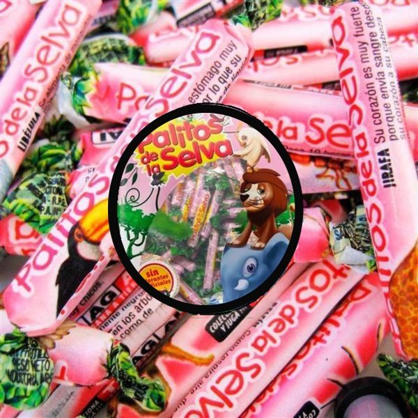 Los palitos de la selva son uno de los caramelos masticables favoritos por los chicos y los grandes argentinos por su sabor y diseño. Es un caramelo masticable sabor a frutilla y vainilla, libre de fluten, sin tacc.