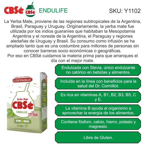 Cuando hablás de CBSé Endulife, hablás de una yerba endulzada naturalmente. Este nuevo rediseño cuenta con la dulzura de la Stevia, el único endulzante no calórico en bebidas y alimentos. Una yerba mate común con el dulzor natural justo. Incluída en la línea con beneficios para la salud del Dr. Cormillot.