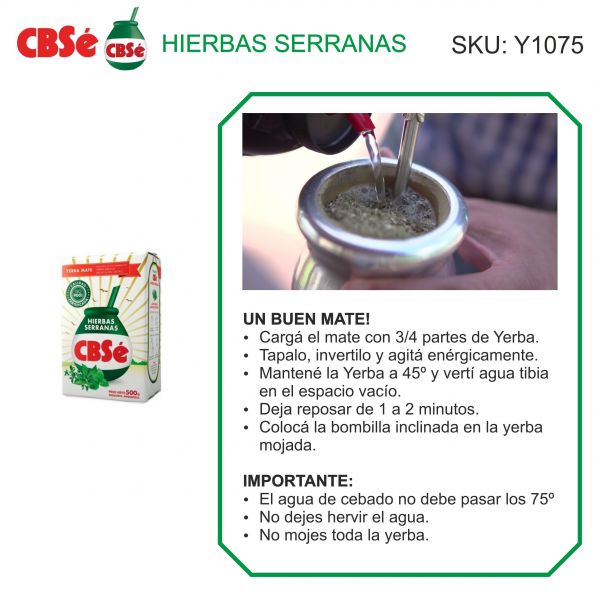 CBSé Hierbas Serranas hace tu día delicioso y refrescante gracias a la combinación ideal de la mejor yerba mate y una fina selección de hierbas serranas: menta, poleo y peperina.