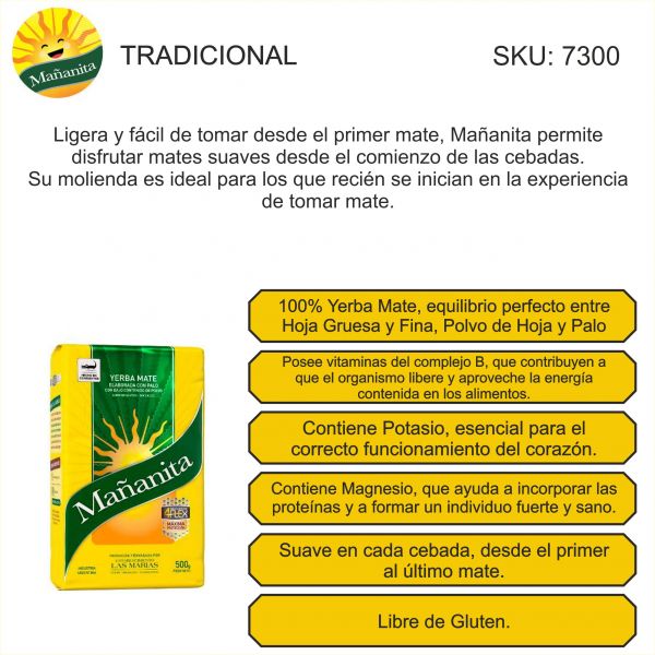 Fácil de tomar desde el primer mate, Mañanita permite disfrutar mates suaves y ligeros desde el comienzo de las cebadas. Su molienda hecha a partir de lotes suaves y con bajo contenido de polvo, es ideal para los que recién se inician en la experiencia de tomar mate.