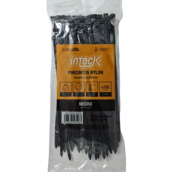 PRECINTO DE NYLON 4.8MM X200MM - NEGRO X 100 UNIDADES INTECK