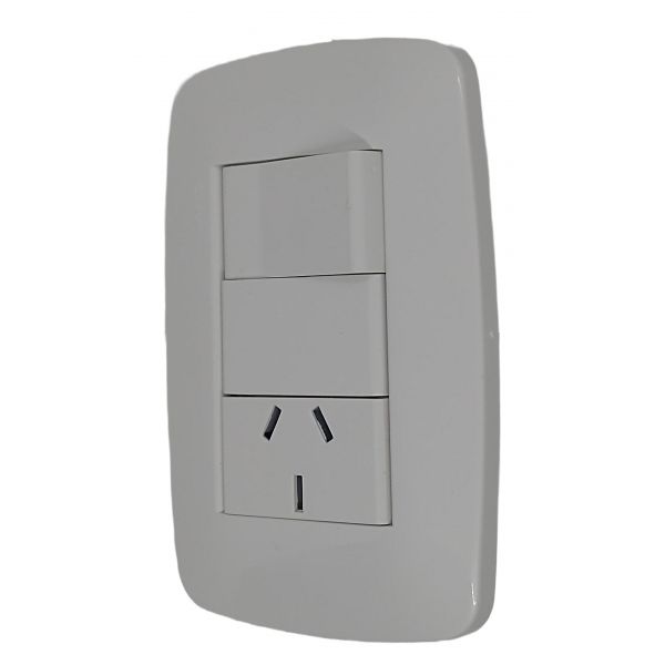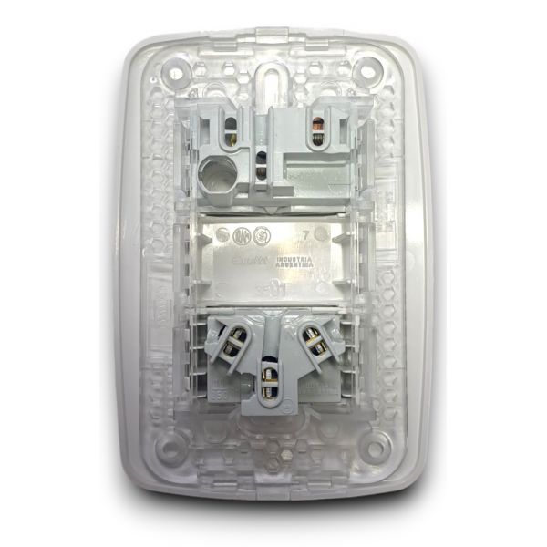 Tapa blanca rectangular + Bastidor de 3 módulos + 1 Interruptor + 1 Tomacorriente con toma de tierra + 1 Módulo ciego.
