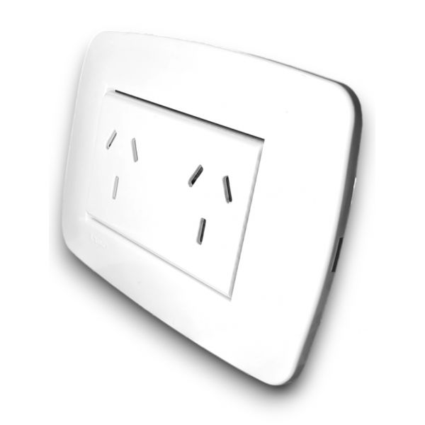 Tapa blanca rectangular + Bastidor de 3 módulos + Tomacorriente doble con toma de tierra (3 modulos).