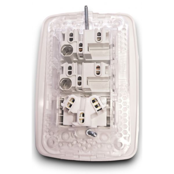 Tapa blanca rectangular + Bastidor de 3 módulos + 2 Interruptor + 1 Tomacorriente con toma de tierra.