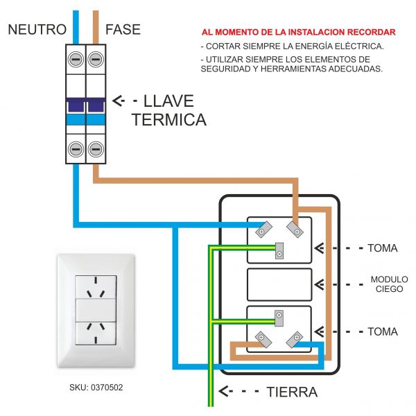 Tapa blanca rectangular + Bastidor de 3 módulos + 2 Tomacorrientes con toma de tierra + Módulo ciego.