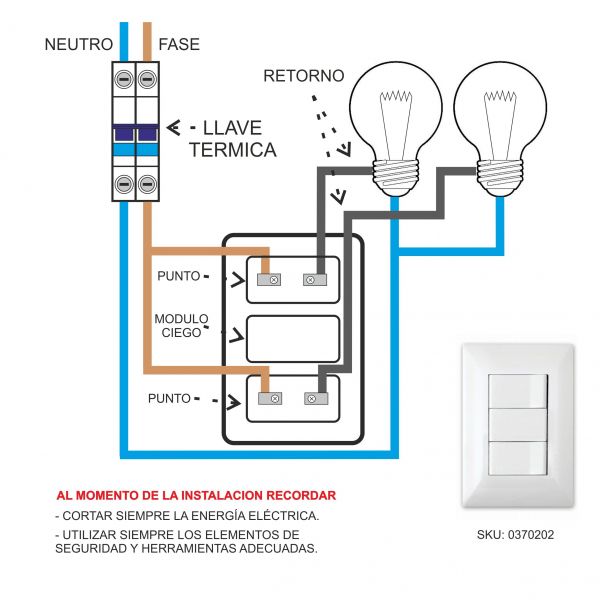 Tapa blanca rectangular + Bastidor de 3 módulos + 2 Interruptores + 1 Módulos ciego.