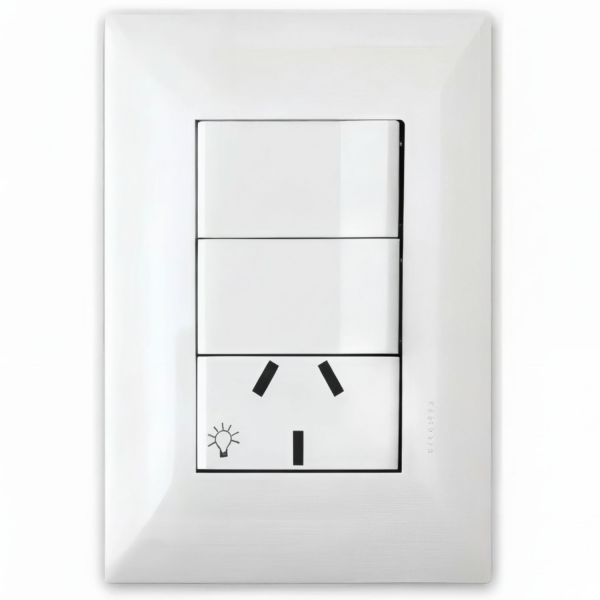 Tapa blanca rectangular + Bastidor de 3 módulos + 2 Interruptor + 1 Tomacorriente con toma de tierra.