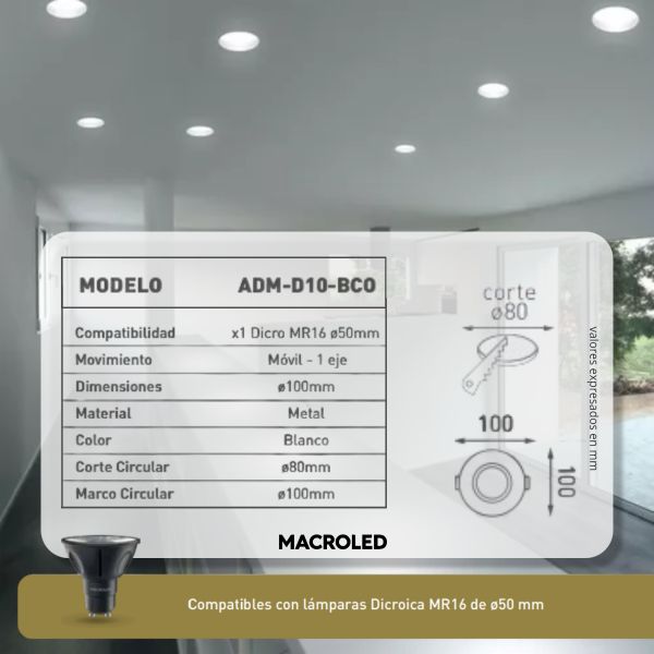 El Aro de Embutir Dicroica Metal Blanco ADM-D10-BCO es una solución de iluminación interior que combina funcionalidad y estilo de manera excepcional.
