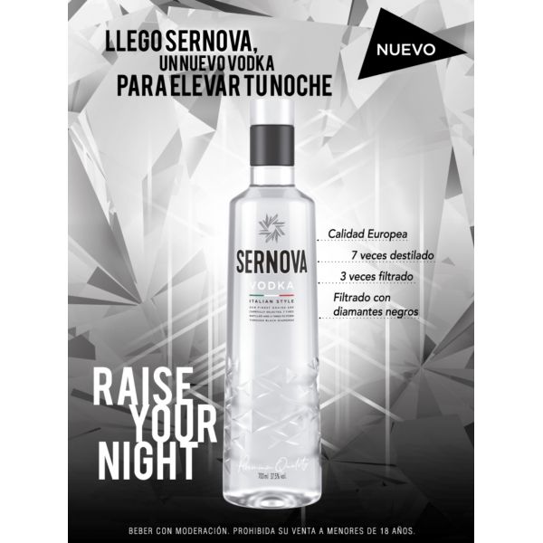 Sernova es un vodka de estilo italiano, que cuenta con un proceso de elaboración sofisticado que da como resultado un producto super premium. Es un vodka elegante y delicado, ideal para divertirse y pasarla bien disfrutando de un producto de altísima calidad. El proceso de producción de Sernova consta de 7 destilaciones y 3 filtraciones, durante las cuales se refina y perfecciona. Además, es el único vodka del mercado local que para su proceso de filtrado emplea diamantes negros para asegurar un producto neutro y puro.